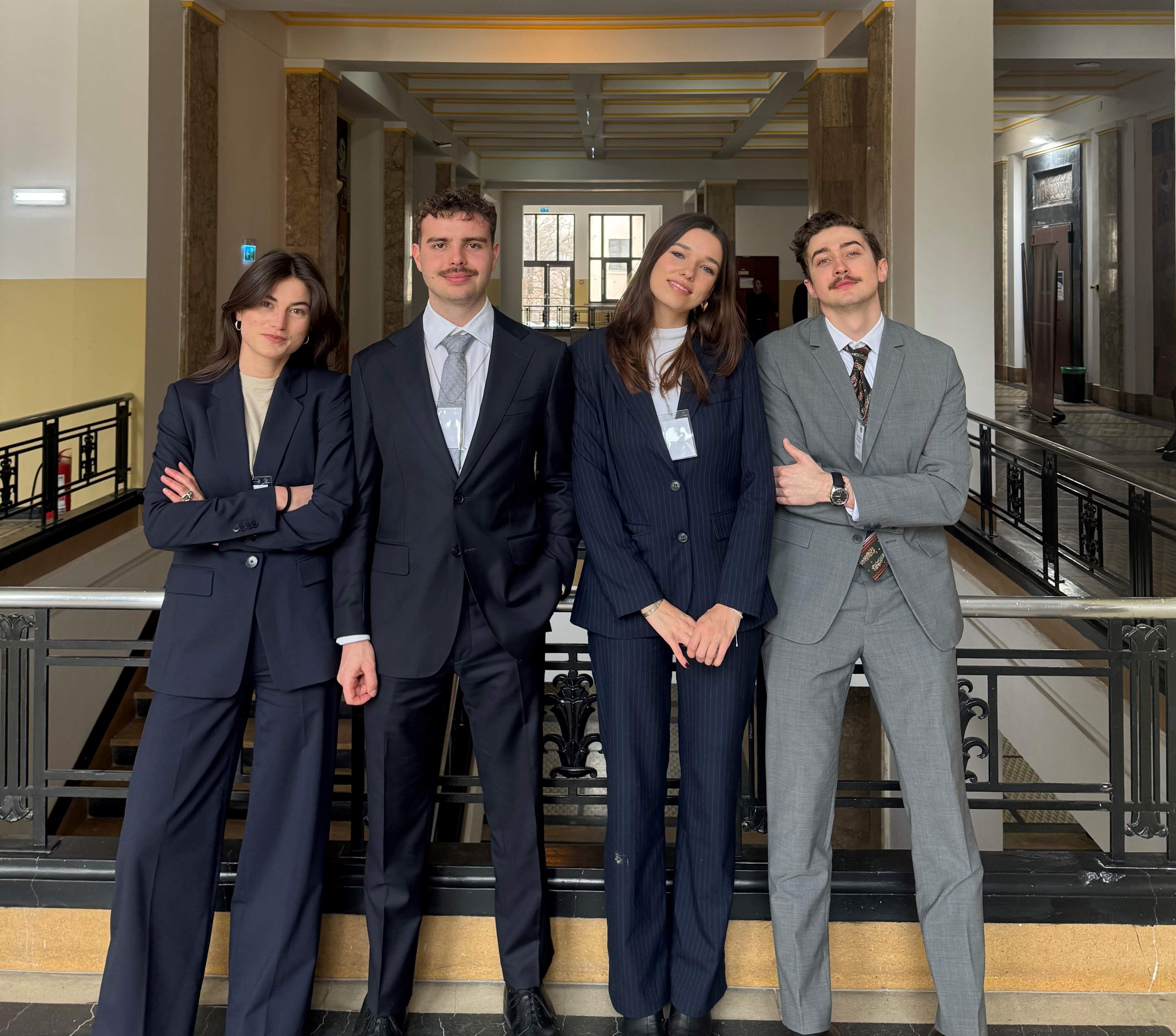 Die RWF gratuliert ihren vier Masterstudierenden (im Bild v.l.n.r.) Yana Caroline Le Bars, Ruben Flloyd Furler, Lise De Beenhouwer und Zdzisław Robert Rypniewski zum erfolgreichen Abschneiden am European Law Moot Court 2025/2026 . Betreut von Alexandru Badea und Johannes Rohrmann schaffte es das Team bis in die regionale (mündliche) Ausscheidungsrunde in Bukarest, nachdem die schriftlichen Eingaben der RWF-Studierenden in der Vorrunde als sehr gut beurteilt worden waren. Am European Law Moot Court nahmen Teams von 100 Universitäten aus der ganzen Welt teil.