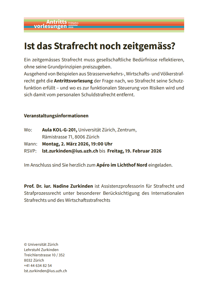 Antrittsvorlesung "Ist das Strafrecht noch zeitgemäss?" - Montag, 2. März 2026, 19:00 Uhr
